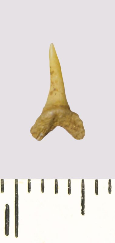 Зуб. Акула. Scapanorhynchus rhaphiodon Agassiz, 1843. Классификация: Хордовые Chordata, Позвоночные Vertebrata, Хрящевые рыбы Chondrichthyes, Пластиножаберные Elasmobranchii