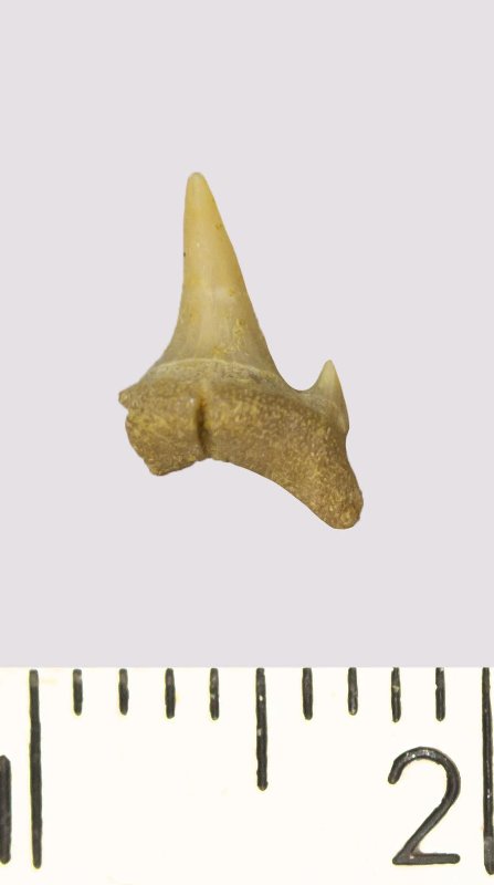 Зуб. Акула. Scapanorhynchus rhaphiodon Agassiz, 1843. Классификация: Хордовые Chordata, Позвоночные Vertebrata, Хрящевые рыбы Chondrichthyes, Пластиножаберные Elasmobranchii