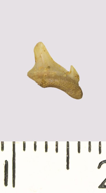 Зуб. Акула. Scapanorhynchus rhaphiodon Agassiz, 1843. Классификация: Хордовые Chordata, Позвоночные Vertebrata, Хрящевые рыбы Chondrichthyes, Пластиножаберные Elasmobranchii