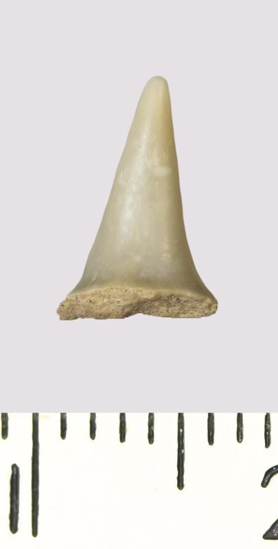 Зуб (фрагмент). Акула. Eostriatolamia venusta (Leriche, 1929). Классификация: Хордовые Chordata, Позвоночные Vertebrata, Хрящевые рыбы Chondrichthyes, Пластиножаберные Elasmobranchii