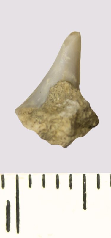 Зуб (фрагмент). Акула. Eostriatolamia venusta (Leriche, 1929). Классификация: Хордовые Chordata, Позвоночные Vertebrata, Хрящевые рыбы Chondrichthyes, Пластиножаберные Elasmobranchii