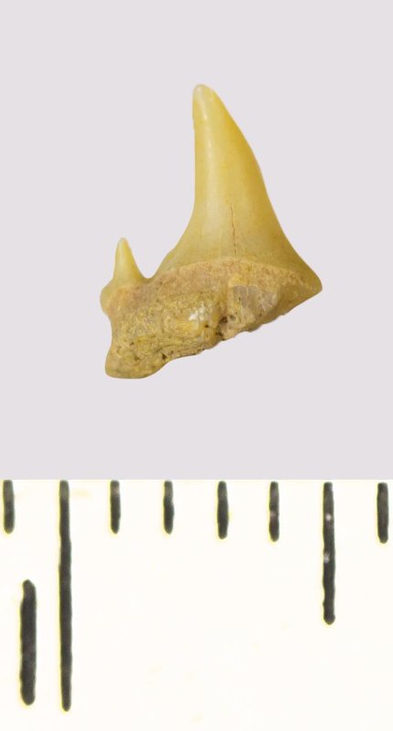 Зуб. Акула. Scapanorhynchus rhaphiodon Agassiz, 1843. Классификация: Хордовые Chordata, Позвоночные Vertebrata, Хрящевые рыбы Chondrichthyes, Пластиножаберные Elasmobranchii