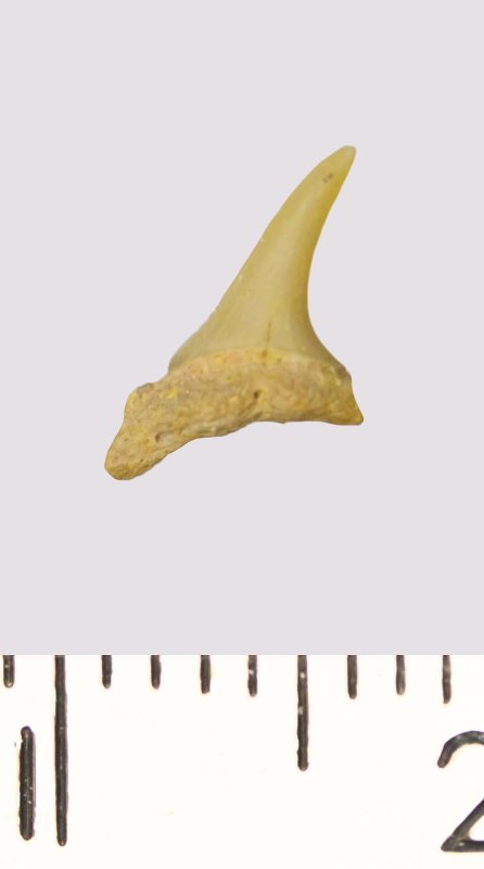 Зуб. Акула. Scapanorhynchus rhaphiodon Agassiz, 1843. Классификация: Хордовые Chordata, Позвоночные Vertebrata, Хрящевые рыбы Chondrichthyes, Пластиножаберные Elasmobranchii