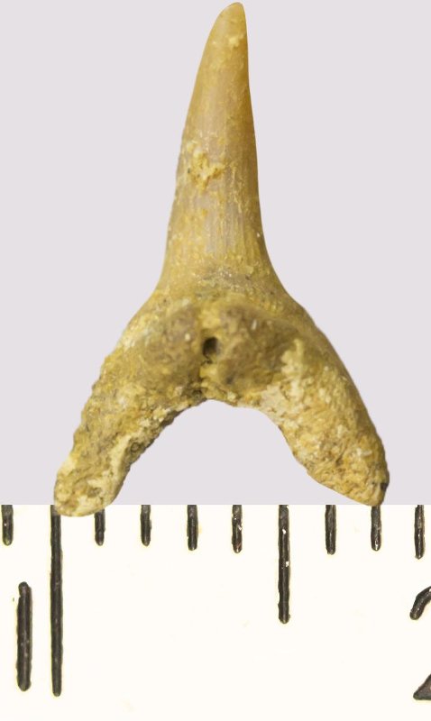 Зуб. Акула. Scapanorhynchus rhaphiodon Agassiz, 1843. Классификация: Хордовые Chordata, Позвоночные Vertebrata, Хрящевые рыбы Chondrichthyes, Пластиножаберные Elasmobranchii