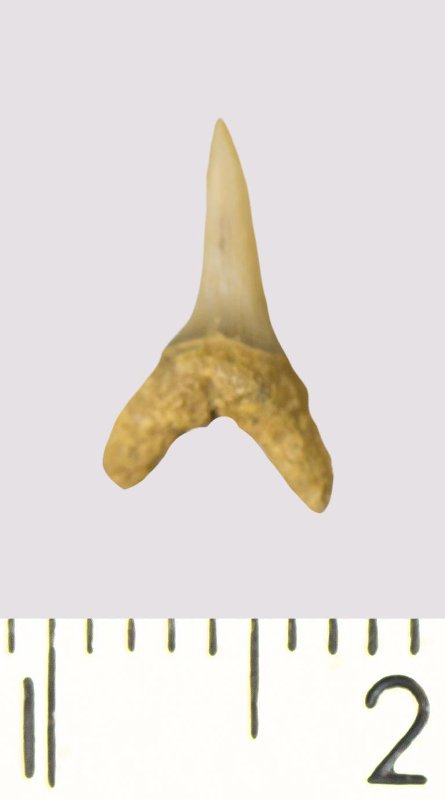 Зуб. Акула. Scapanorhynchus rhaphiodon Agassiz, 1843. Классификация: Хордовые Chordata, Позвоночные Vertebrata, Хрящевые рыбы Chondrichthyes, Пластиножаберные Elasmobranchii