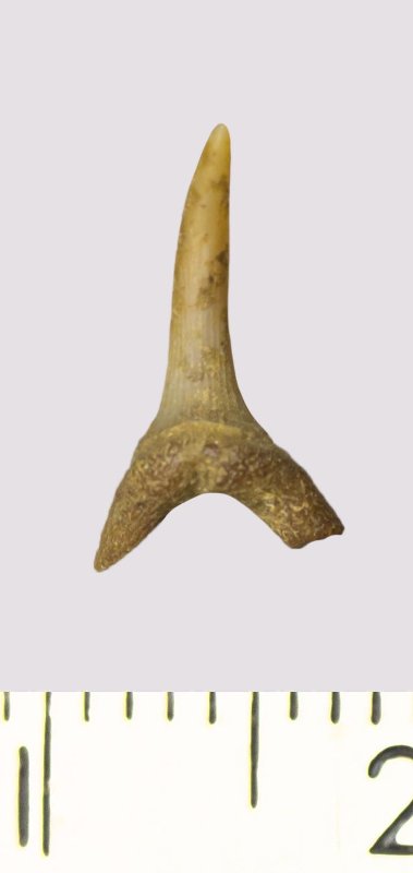Зуб. Акула. Scapanorhynchus rhaphiodon Agassiz, 1843. Классификация: Хордовые Chordata, Позвоночные Vertebrata, Хрящевые рыбы Chondrichthyes, Пластиножаберные Elasmobranchii