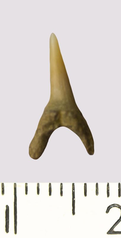 Зуб. Акула. Scapanorhynchus rhaphiodon Agassiz, 1843. Классификация: Хордовые Chordata, Позвоночные Vertebrata, Хрящевые рыбы Chondrichthyes, Пластиножаберные Elasmobranchii