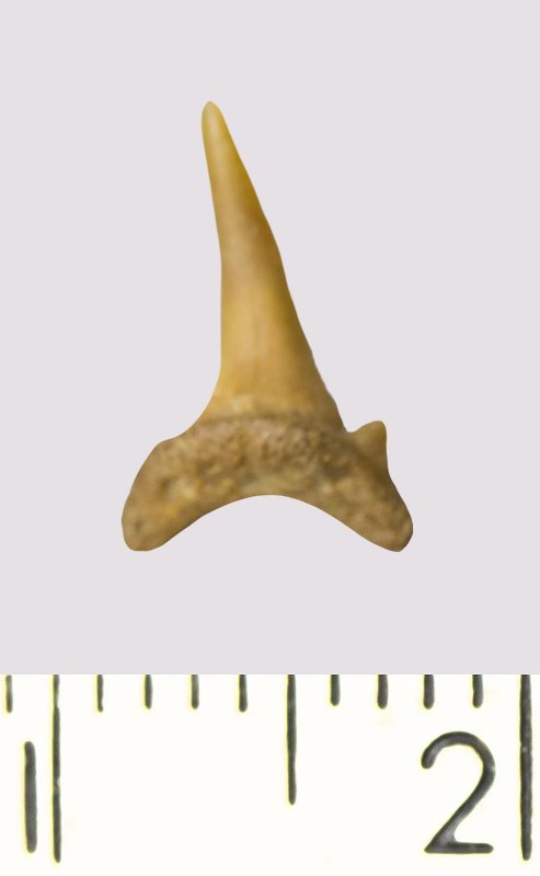 Зуб. Акула. Scapanorhynchus rhaphiodon Agassiz, 1843. Классификация: Хордовые Chordata, Позвоночные Vertebrata, Хрящевые рыбы Chondrichthyes, Пластиножаберные Elasmobranchii