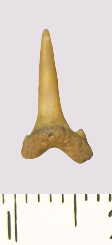 Зуб. Акула. Scapanorhynchus rhaphiodon Agassiz, 1843. Классификация: Хордовые Chordata, Позвоночные Vertebrata, Хрящевые рыбы Chondrichthyes, Пластиножаберные Elasmobranchii