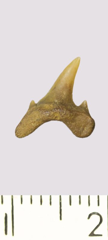 Зуб. Акула. Scapanorhynchus rhaphiodon Agassiz, 1843. Классификация: Хордовые Chordata, Позвоночные Vertebrata, Хрящевые рыбы Chondrichthyes, Пластиножаберные Elasmobranchii