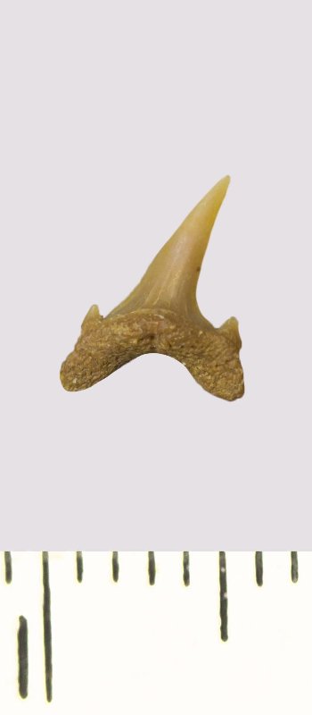 Зуб. Акула. Scapanorhynchus rhaphiodon Agassiz, 1843. Классификация: Хордовые Chordata, Позвоночные Vertebrata, Хрящевые рыбы Chondrichthyes, Пластиножаберные Elasmobranchii