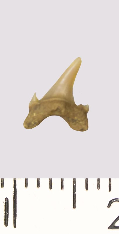 Зуб. Акула. Scapanorhynchus rhaphiodon Agassiz, 1843. Классификация: Хордовые Chordata, Позвоночные Vertebrata, Хрящевые рыбы Chondrichthyes, Пластиножаберные Elasmobranchii