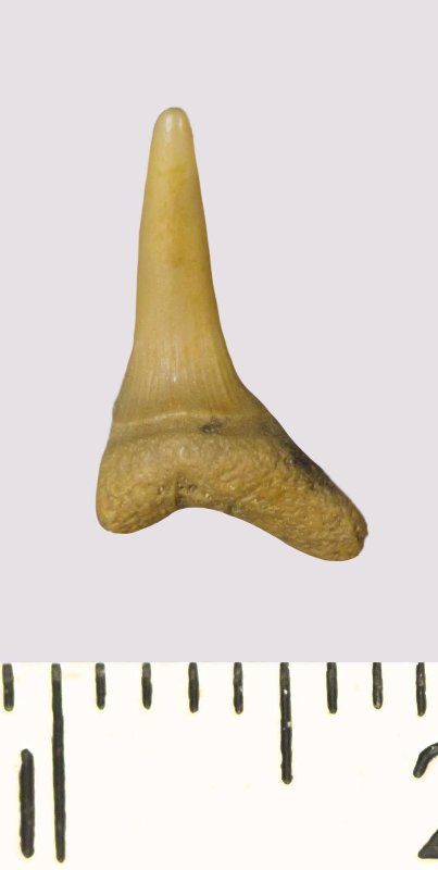 Зуб. Акула. Scapanorhynchus rhaphiodon Agassiz, 1843. Классификация: Хордовые Chordata, Позвоночные Vertebrata, Хрящевые рыбы Chondrichthyes, Пластиножаберные Elasmobranchii