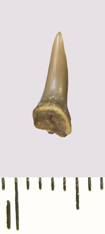 Зуб (фрагмент). Акула. Odontaspis macrorhiza (Cope) Leriche, 1902. Классификация: Хордовые Chordata, Позвоночные Vertebrata, Хрящевые рыбы Chondrichthyes, Пластиножаберные Elasmobranchii
