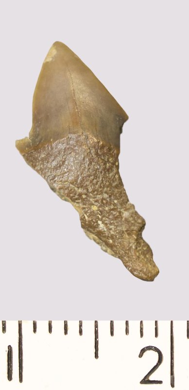 Зуб (фрагмент). Акула. Anacorax kaupi (Agassiz, 1843). Классификация: Хордовые Chordata, Позвоночные Vertebrata, Хрящевые рыбы Chondrichthyes, Пластиножаберные Elasmobranchii