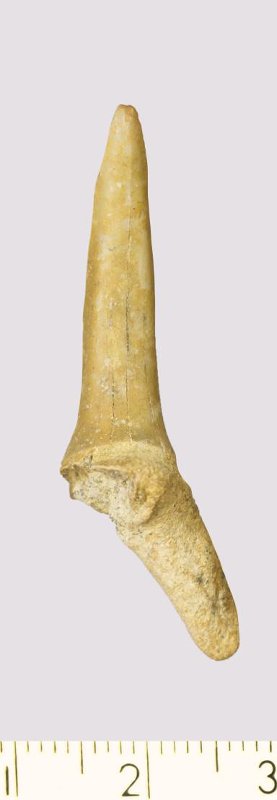 Зуб. Акула. Scapanorhynchus gigas Woodward, 1889. Классификация: Хордовые Chordata, Позвоночные Vertebrata, Хрящевые рыбы Chondrichthyes, Пластиножаберные Elasmobranchii