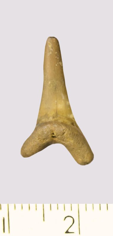 Зуб. Акула. Scapanorhynchus gigas Woodward, 1889. Классификация: Хордовые Chordata, Позвоночные Vertebrata, Хрящевые рыбы Chondrichthyes, Пластиножаберные Elasmobranchii