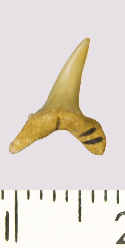 Зуб. Акула. Scapanorhynchus rhaphiodon Agassiz, 1843. Классификация: Хордовые Chordata, Позвоночные Vertebrata, Хрящевые рыбы Chondrichthyes, Пластиножаберные Elasmobranchii