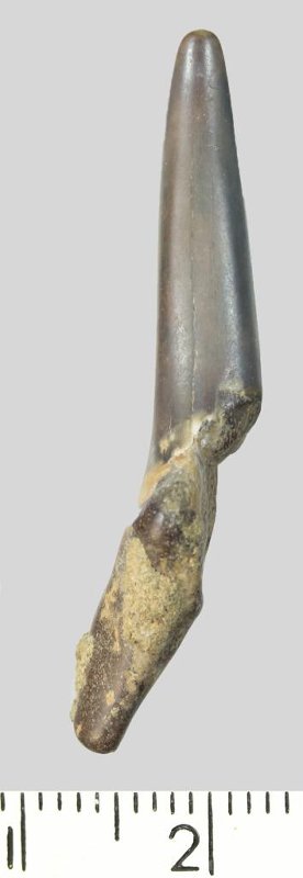 Зуб. Акула. Scapanorhynchus gigas Woodward, 1889. Классификация: Хордовые Chordata, Позвоночные Vertebrata, Хрящевые рыбы Chondrichthyes, Пластиножаберные Elasmobranchii