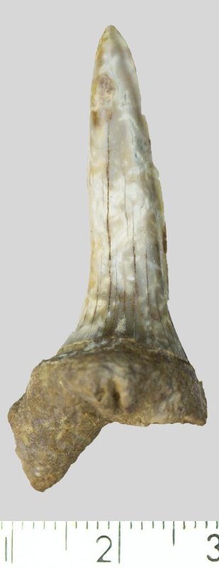 Зуб. Акула. Hispidaspis sp. Классификация: Хордовые Chordata, Позвоночные Vertebrata, Хрящевые рыбы Chondrichthyes, Пластиножаберные Elasmobranchii