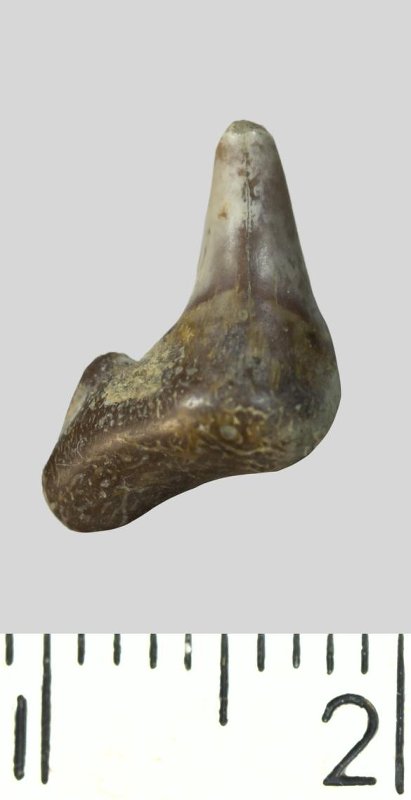 Зуб. Акула. Odontaspis macrorhiza (Cope) Leriche, 1902. Классификация: Хордовые Chordata, Позвоночные Vertebrata, Хрящевые рыбы Chondrichthyes, Пластиножаберные Elasmobranchii