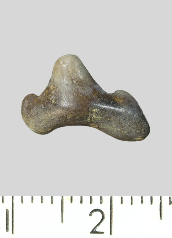 Зуб. Акула. Scapanorhynchus gigas Woodward, 1889. Классификация: Хордовые Chordata, Позвоночные Vertebrata, Хрящевые рыбы Chondrichthyes, Пластиножаберные Elasmobranchii