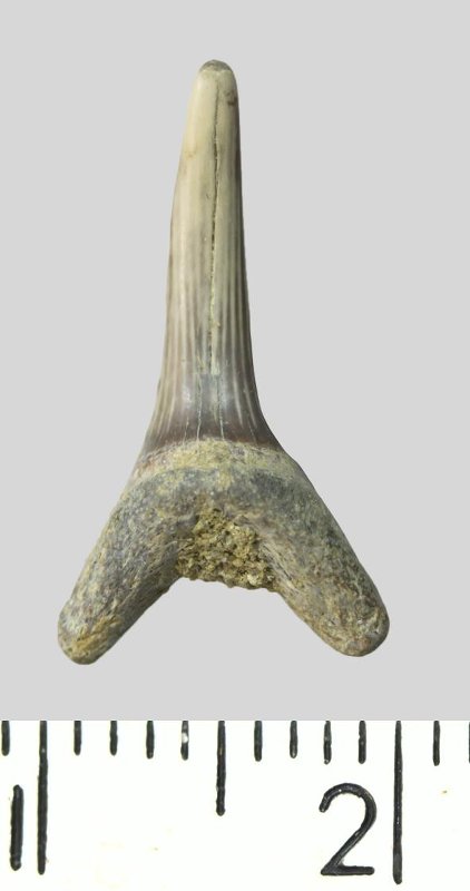 Зуб. Акула. Scapanorhynchus sp. Классификация: Хордовые Chordata, Позвоночные Vertebrata, Хрящевые рыбы Chondrichthyes, Пластиножаберные Elasmobranchii