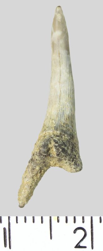 Зуб. Акула. Scapanorhynchus sp. Классификация: Хордовые Chordata, Позвоночные Vertebrata, Хрящевые рыбы Chondrichthyes, Пластиножаберные Elasmobranchii