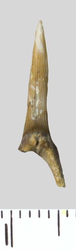 Зуб. Акула. Scapanorhynchus sp. Классификация: Хордовые Chordata, Позвоночные Vertebrata, Хрящевые рыбы Chondrichthyes, Пластиножаберные Elasmobranchii