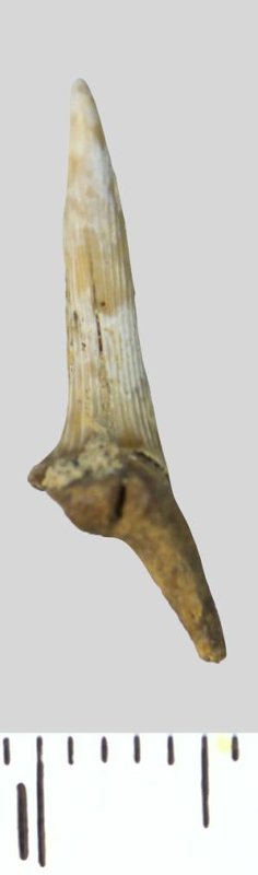 Зуб. Акула. Scapanorhynchus sp. Классификация: Хордовые Chordata, Позвоночные Vertebrata, Хрящевые рыбы Chondrichthyes, Пластиножаберные Elasmobranchii