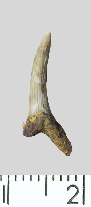 Зуб. Акула. Scapanorhynchus sp. Классификация: Хордовые Chordata, Позвоночные Vertebrata, Хрящевые рыбы Chondrichthyes, Пластиножаберные Elasmobranchii