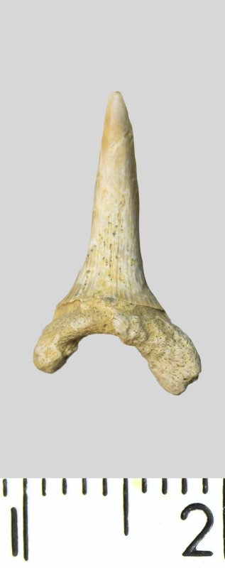 Зуб. Акула. Scapanorhynchus sp. Классификация: Хордовые Chordata, Позвоночные Vertebrata, Хрящевые рыбы Chondrichthyes, Пластиножаберные Elasmobranchii