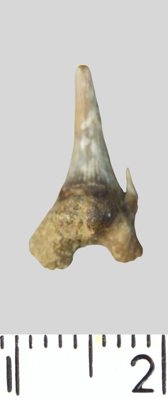 Зуб. Акула. Scapanorhynchus sp. Классификация: Хордовые Chordata, Позвоночные Vertebrata, Хрящевые рыбы Chondrichthyes, Пластиножаберные Elasmobranchii