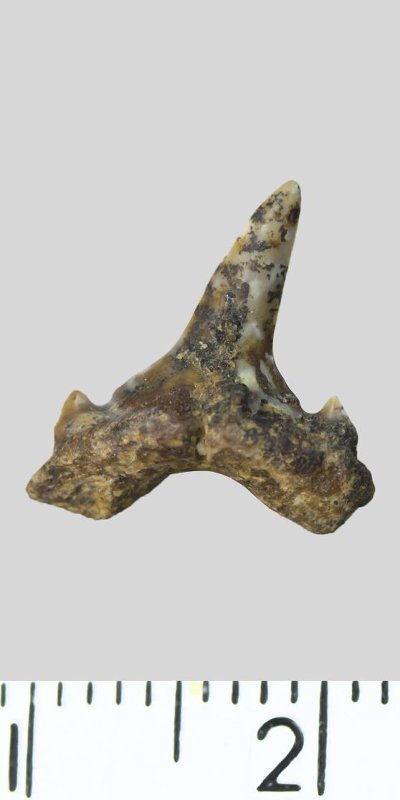 Зуб. Акула. Scapanorhynchus sp. Классификация: Хордовые Chordata, Позвоночные Vertebrata, Хрящевые рыбы Chondrichthyes, Пластиножаберные Elasmobranchii