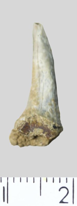 Зуб (фрагмент). Акула. Scapanorhynchus sp. Классификация: Хордовые Chordata, Позвоночные Vertebrata, Хрящевые рыбы Chondrichthyes, Пластиножаберные Elasmobranchii