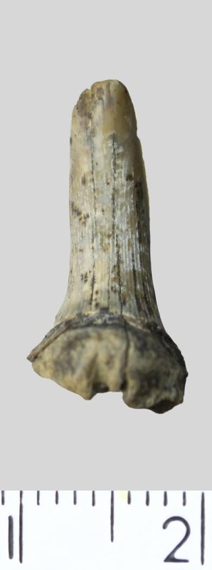 Зуб (фрагмент). Акула. Scapanorhynchus sp. Классификация: Хордовые Chordata, Позвоночные Vertebrata, Хрящевые рыбы Chondrichthyes, Пластиножаберные Elasmobranchii