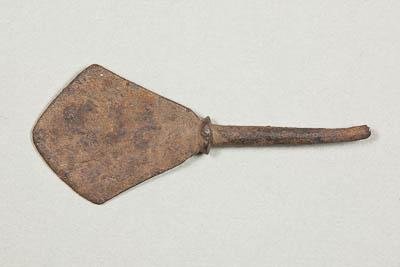 Железный наконечник стрелы черешкового типа. Форма жала ромбическая, с ребром жёсткости. Ромб - неравнобокий, нижние стороны - длинее. Основание жала выполнено в виде небольшой круглой площадки, которая отделяет жало от черешка, вероятно препятствуя расшеплению древка по жалу, при попадании стрелы в цель. Кончик черешка облома и чуть загнут.