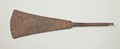 Железный наконечник стрелы черешкового типа. Форма жала трапецевидная. Основание трапеции - это кончик наконечника. Такой тип можно назвать - срезень. Основание жала выполнено в виде небольшой круглой площадки, которая отделяет жало от черешка, вероятно препятствуя расщеплению древка по жалу, при попадании стрелы в цель.Черешок очень мощный, кончик обломан.