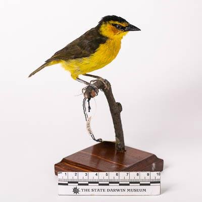 Чучело. Короткокрылый ткач. Ploceus nigricollis (Vieillot, 1805). Классификация: Хордовые Chordata, Позвоночные Vertebrata, Птицы Aves, Воробьинообразные Passeriformes, Ткачиковые Ploceidae