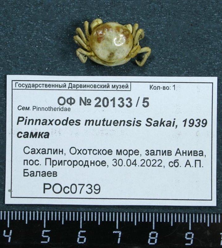 краб-горошина. Pinnaxodes mutuensis Sakai, 1939, Pinnotheridae, самка. Классификация: Членистоногие Arthropoda, Высшие раки (подтип Crustacea) Malacostraca, Десятиногие ракообразные Decapoda, Крабы Brachyura