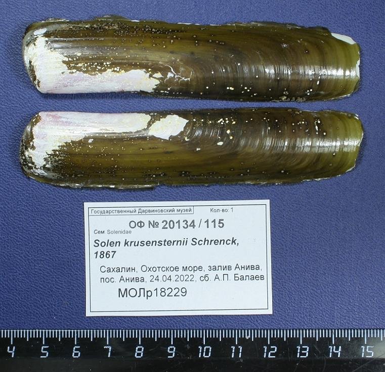 морской двустворчатый моллюск. Solen krusensternii Schrenck, 1867, Solenidae. Классификация: Моллюски Mollusca, Двустворчатые моллюски Bivalvia