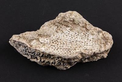 Фрагмент колонии на субстрате. Мшанка. Polypora ornata Waagen & Pichl, 1885. Классификация: Мшанки Bryozoa, Голоротые Gymnolaemata, Скрыторотые Cryptostomata, Мшанка Polypora ornata Waagen & Pichl, 1885