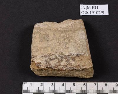 Фрагмент стебля хвощевого на субстрате. Сохранилась фитолейма, выделяющаяся более темным цветом (коричневым) на более светлом - бежевом субстрате. Во фрагменте сохранился узел и два междоузлия. Соотношение длины междоузлий к ширине побега 6,7:1. Продольные ребра простые, округлые. Отпечаток побега хвоща пропитан каким-то составом (клеем).