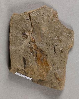 Отпечаток на субстрате. Жилкование продольное. Отпечаталась лишь черешковая часть листа. Порода представлена плотным песчаником серовато-бежевого цвета. Отпечаток побега хвоща пропитан каким-то составом (клеем).