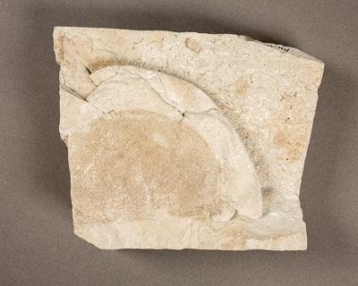 Отпечаток просомы мечехвоста. Панцирь отпечатался с верхней стороны . Порода вырезана в виде неправильного параллелограмма. Порода представлена мергелем светло-бежевым.