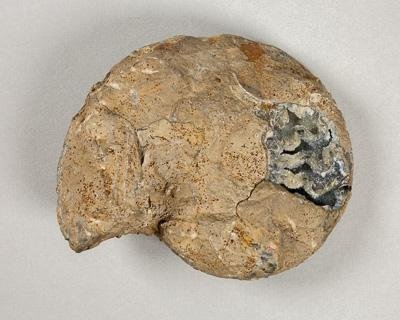 Опализированное внутреннее ядро раковины. Раковина спирально-плоскостная, полуэволютная. Лопастная линия аммонитовая, четко видна на правой стороне ядра. Внешняя скульптура не сохранилась. Цвет раковины от бежевой до коричневой. На левой стороне в нижней части раковины крупный скол, под которым четко различимы опализированные перегородки камер. Также слева раковина частично покрыта породой - твердой глиной с примесью среднезернистого песка. Цвет серый.