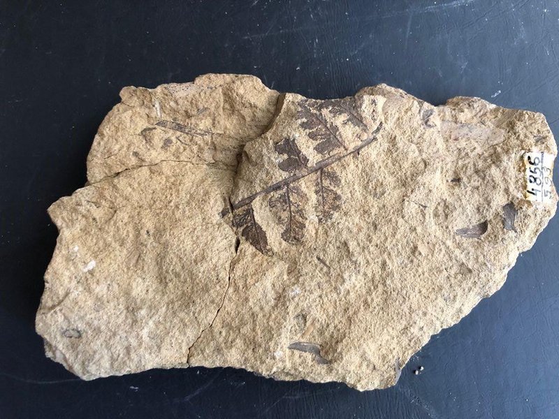 Отпечаток листа на мергеле. Папоротник. Pecopteris cf. suksunensis Zalessky, 1939. Классификация: Растения Plantae, Папоротникообразные Polypodyophyta, Папоротники Polypodiopsida, Папоротник Filicales, Filices, Папоротник Pecopteris suksunensis Zalessky, 1939