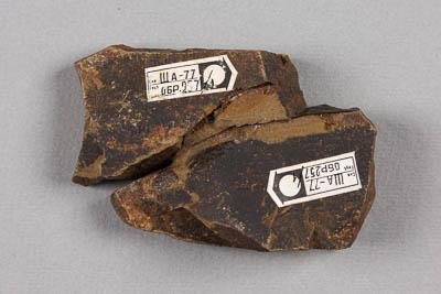 Отпечаток побега хвойного на породе. Порода представлена крепко сцементированным алевролитом красновато-бежевым на сколе, черным по напластованию.