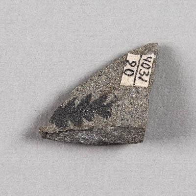 Отпечаток фрагмента вайи на породе. Перышки слабо рассечены. Отпечатки выделяются черным цветом, цвет породы - серый. Порода представлена среднезернистым песчаником.