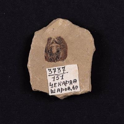Отпечаток семени хвойного на породе. Порода представлена плотным алевролитом бежевого цвета.